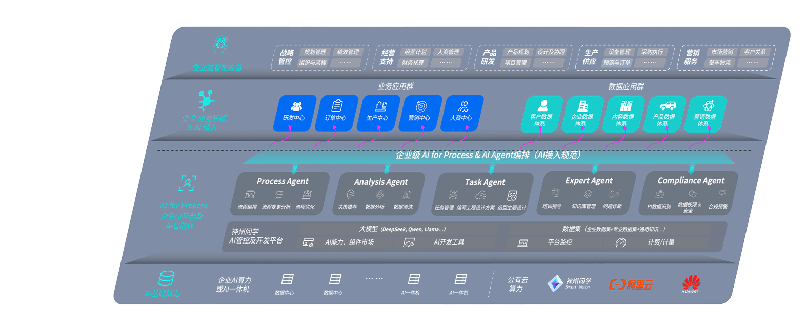 端到端的一站式AI工作空间深度融合了从企业战略规划到日常经营的全流程业务板块,,,定向解决车企内部领域多、、、、部门多、、、、链条长、、场景碎片化等难题,,支持车企快速构建以AI为核心的生产力写作体系,,,,实现任务执行与AI能力的无缝集成与交互