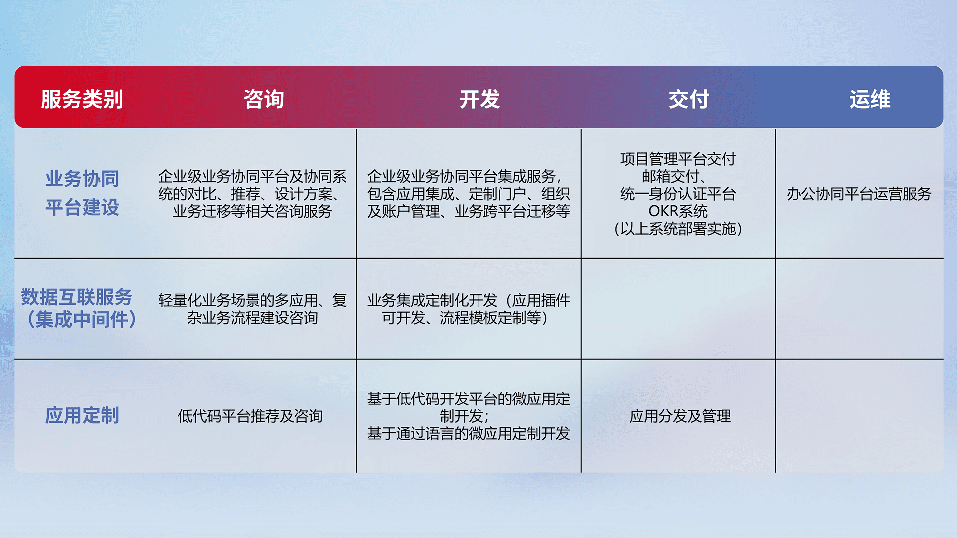 针对钉钉、、企微、、、IDaas等平台级产品提供产品的规划、、、方案、、、交付、、定制化开发等服务,,,,实现如统一协同办公、、智能客户服务、、、混合会议管理、、、、智能数据查询、、、等业务场景,,,,实现数字化转型。。